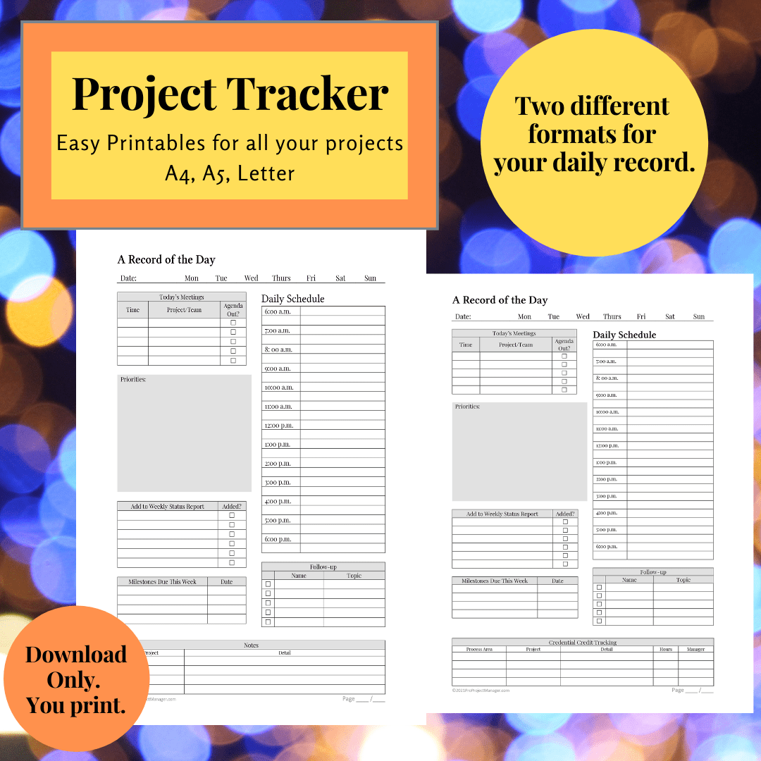 Print and insert into your binder and begin tracking your projects now. Project management documentation saves time and trouble as your project runs. Use these notes to be prepared for questions by your stakeholders.