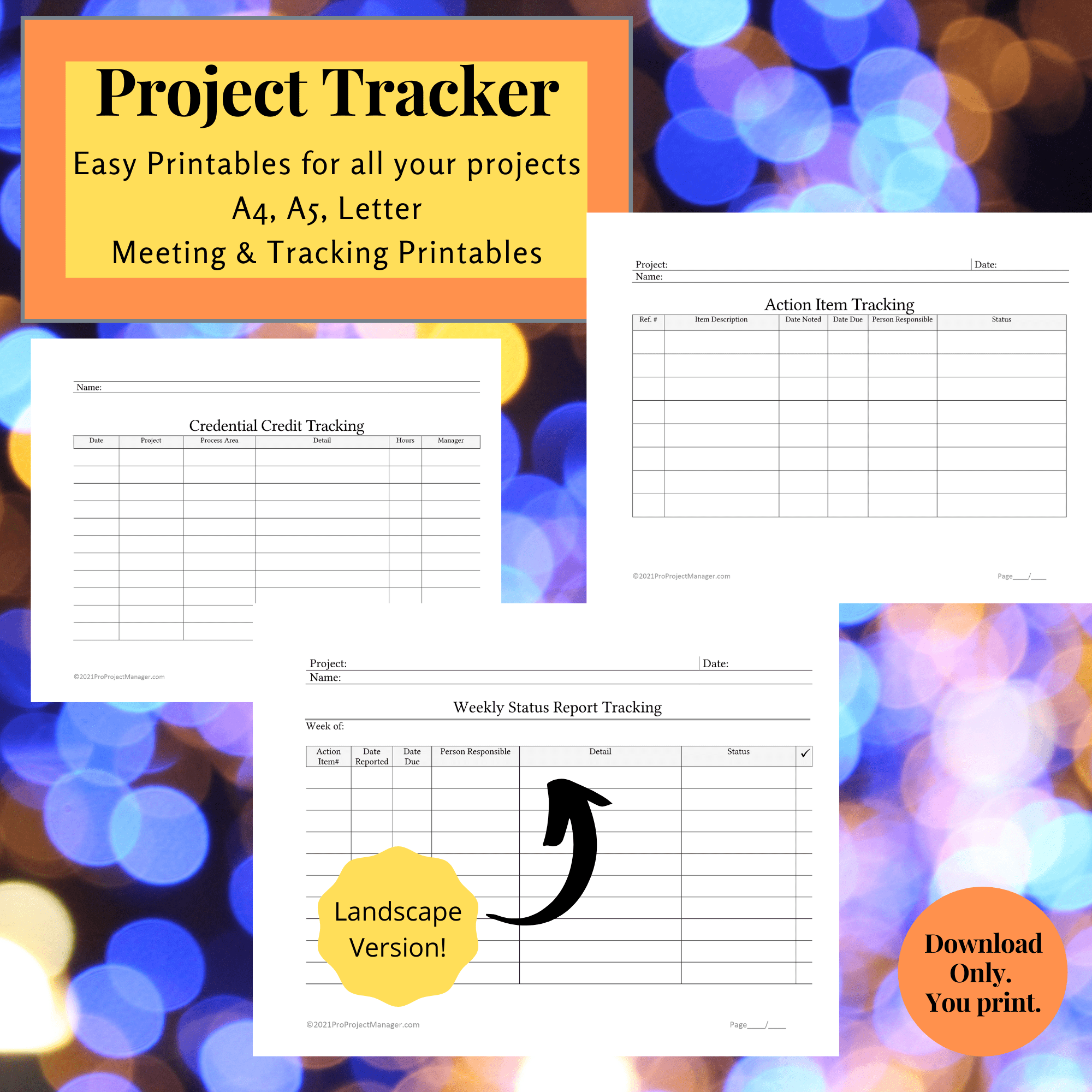 This kit includes two formats for daily schedule tracking, two different weekly status report tracking sheet, a meeting agenda, action item tracking, and a form for a project charter. These PDF pages are sized for
